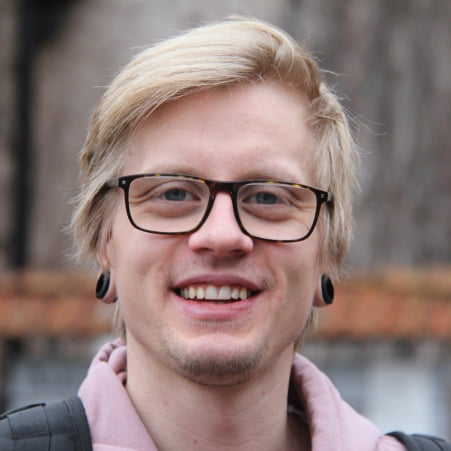 –”Förut har jag alltid haft svårt för studier, men här har jag blivit personligt engagerad i kursen”, berättar han. Klassen är en bra blandning av olika åldrar och livserfarenheter. ”Vi trivs bra ihop och utvecklas tillsammans”, säger han. ”Ju större olikheter desto mer stimulerande!” Robin har valt att bo på skolan eftersom han har behov av struktur, något som inte funkade för honom på gymnasiet.